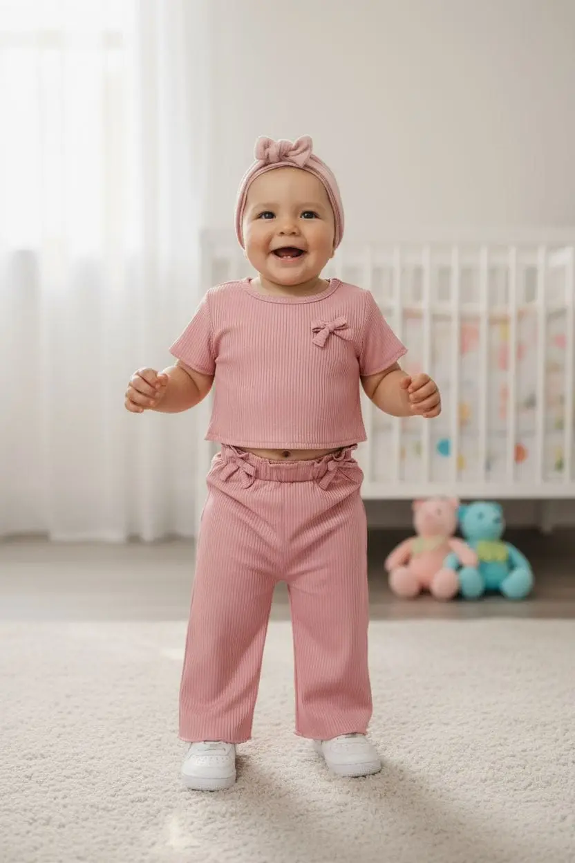 ✨ Pantalón a juego con elástico en la cintura y un detalle de volantes o fruncido que le añade un toque adorable, además de su tela suave que permite total libertad de movimiento.