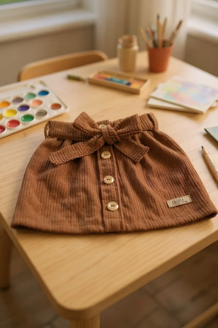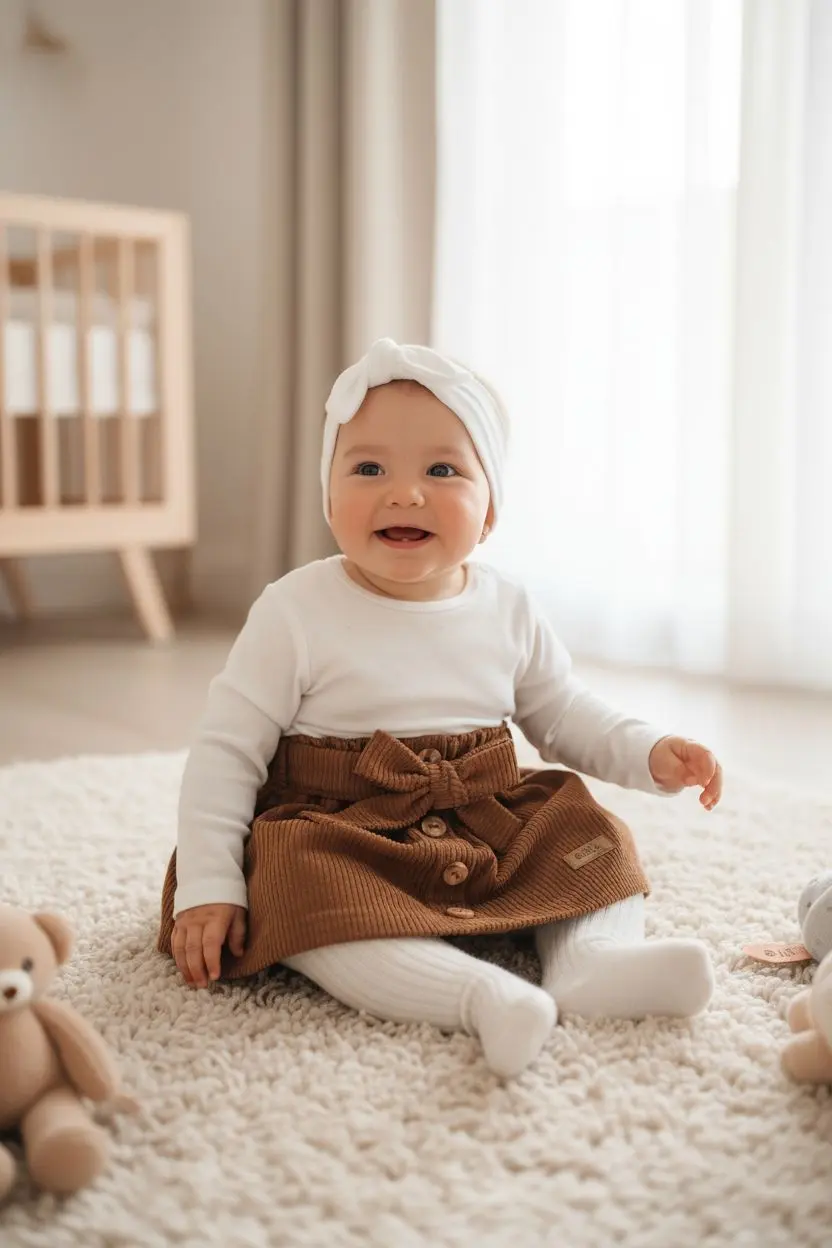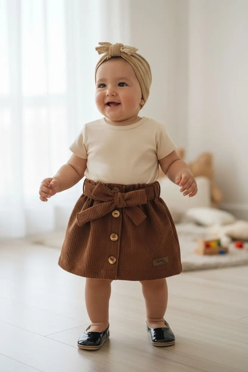 Añade un toque de dulzura y sofisticación al armario de tu bebé con nuestra encantadora faldita de pana. Confeccionada en una suave pana de algodón en un cálido tono tostado, esta prenda es perfecta para cualquier ocasión, brindando la máxima comodidad a tu pequeña exploradora.