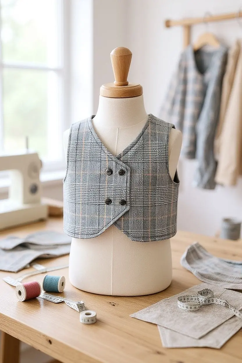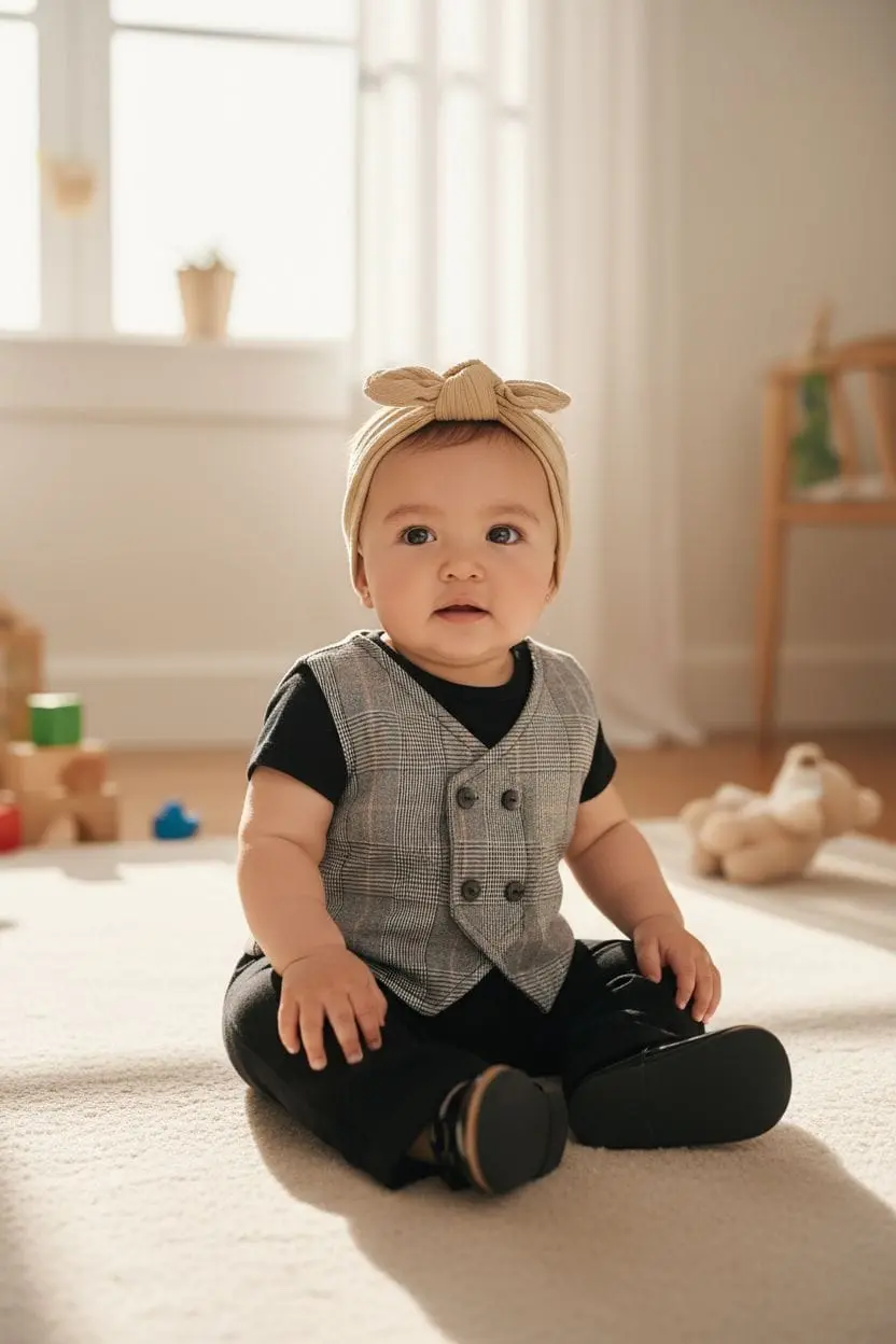 Este precioso chaleco para ni帽as es la definici贸n de moda chic y confortable. El patr贸n de cuadros en tonos neutros (gris, blanco y un toque nude) es atemporal y f谩cil de combinar.