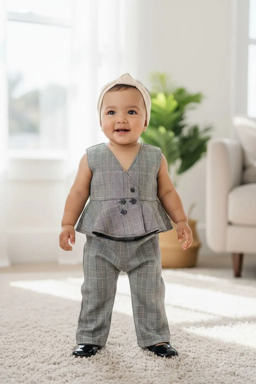 隆Prepara a tu peque帽a para conquistar el mundo con este adorable y chic conjunto! 馃ぉ El chaleco estilo sastre con estampado de cuadros pr铆ncipe de Gales y un toque peplum es la definici贸n de elegancia infantil. Los pantalones a juego, s煤per c贸modos y con cintura el谩stica, garantizan que la moda no re帽ir谩 con la diversi贸n.