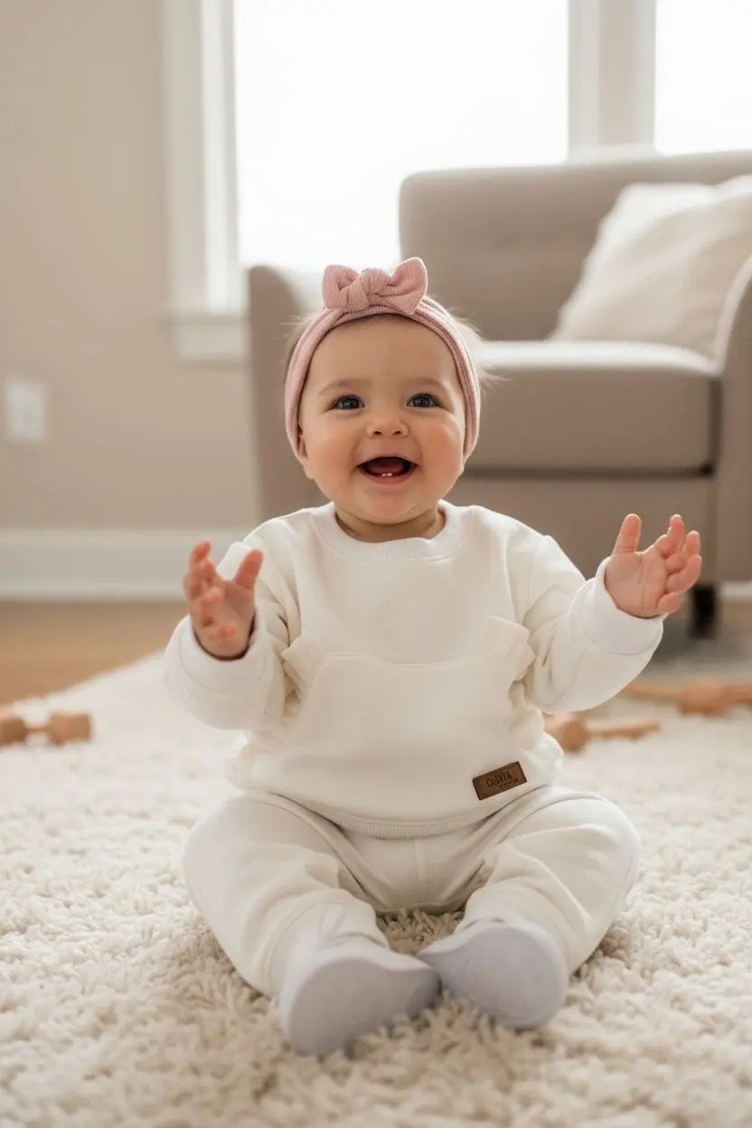 Una prenda esencial para el guardarropa de tu pequeña. Confeccionado en un suave y acogedor joggin afelpado color crema, este suéter ofrece la máxima comodidad y calidez para los días más frescos.